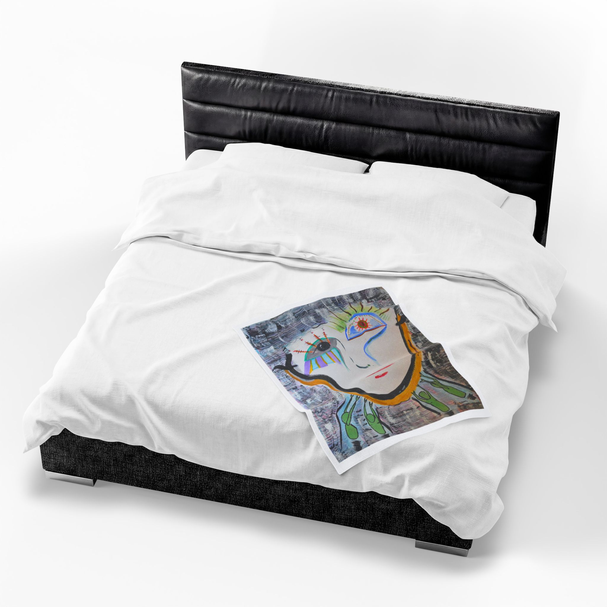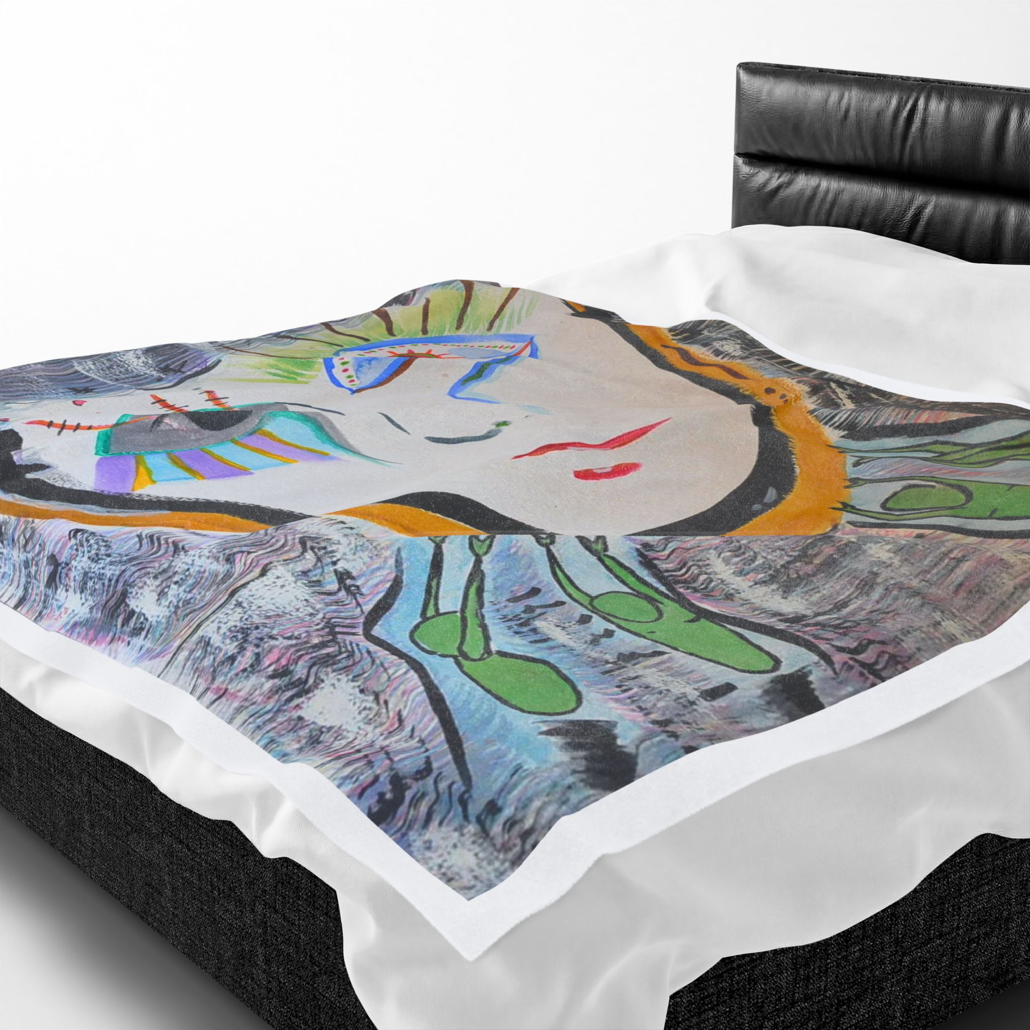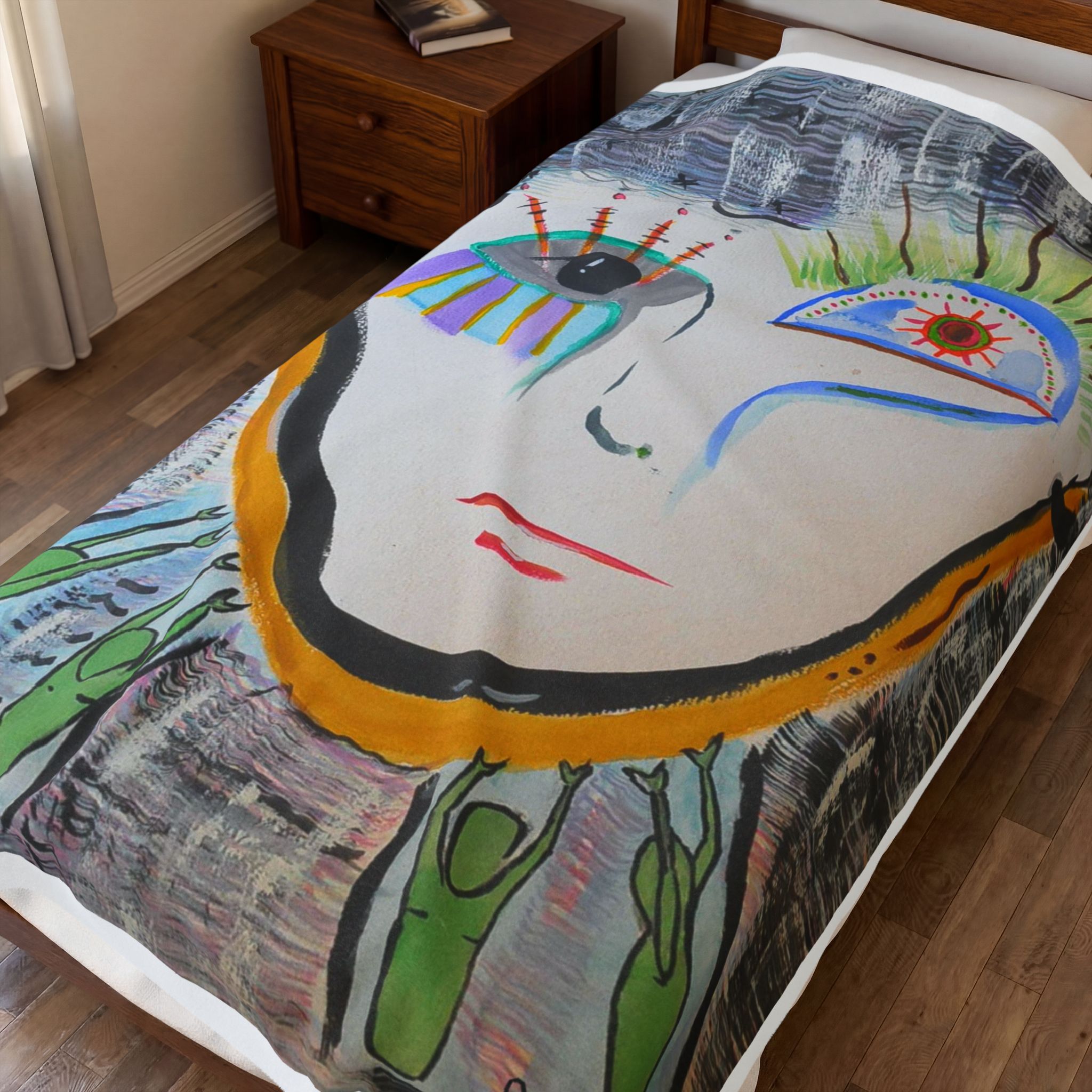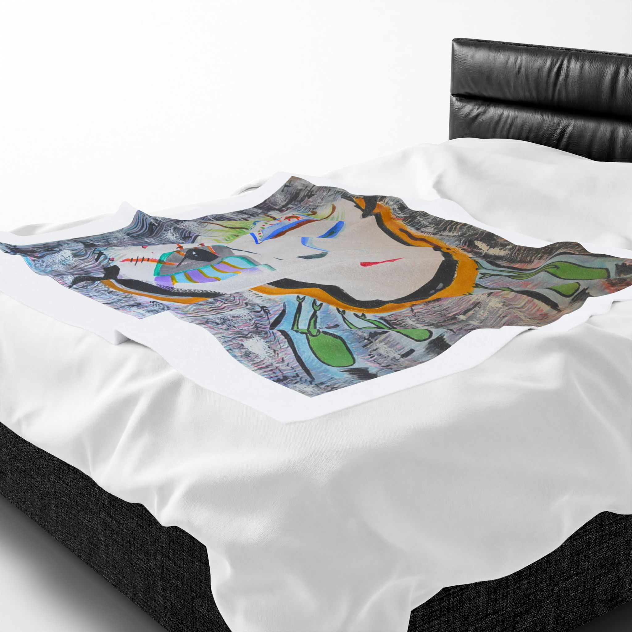 Wrap yourself in a wearable piece of art that feels like a quiet afternoon in a sunlit studio. This velveteen plush blanket pairs a painterly portrait and whimsical floral spirals with a buttery-soft, medium-weight fabric that holds colour beautifully. It settles in warm, plush comfort across your knees while the lively, hand-drawn design adds an artful note to a living room sofa, a reading nook, or a creative workspace. Thoughtful double-stitched edges keep the shape wash after wash, and the single-sided high-detail print keeps the artwork vivid without overwhelming the room. Reach for it when you want comfort with character — a small, tactile way to bring colour and calm into everyday moments and slower celebrations among friends and fellow art lovers.