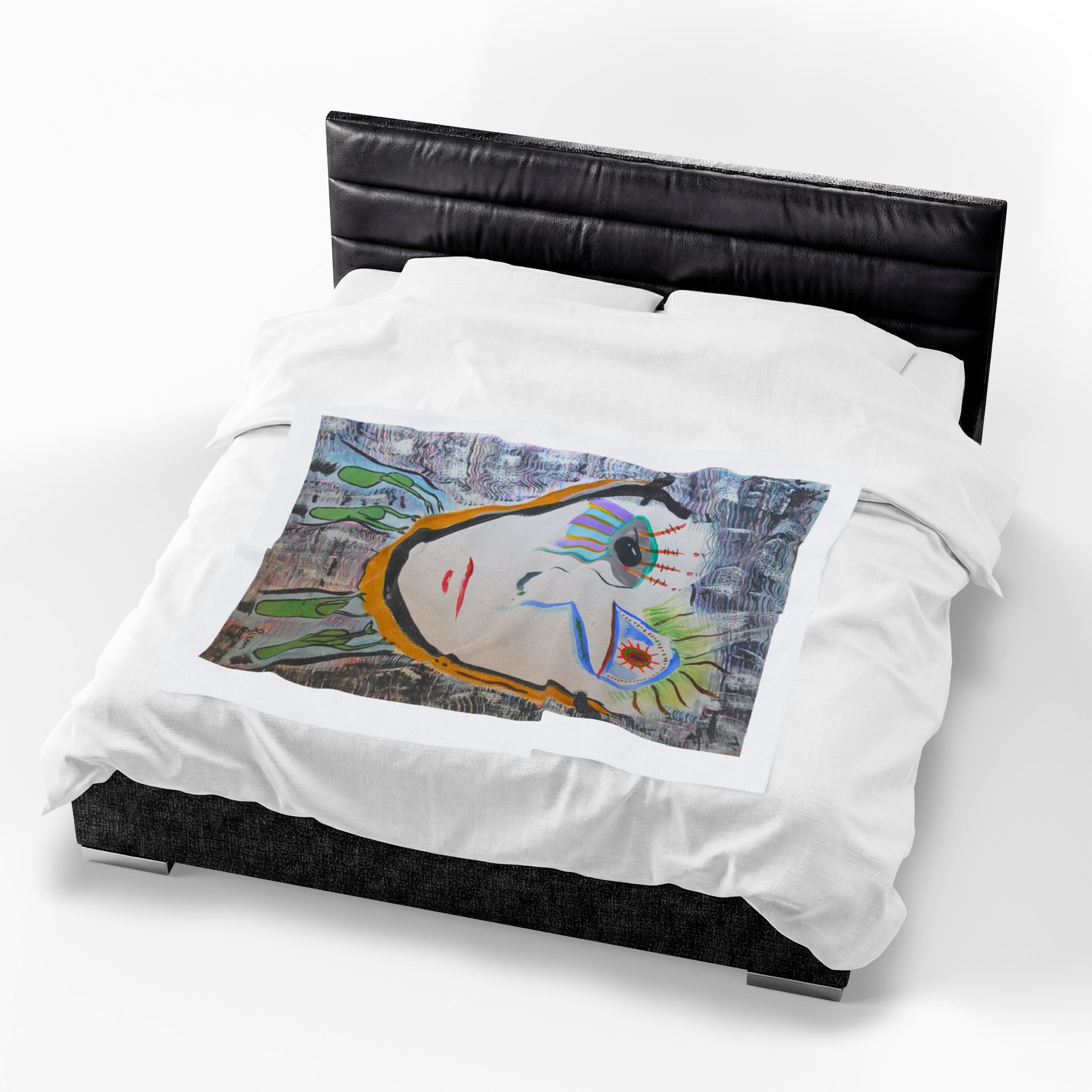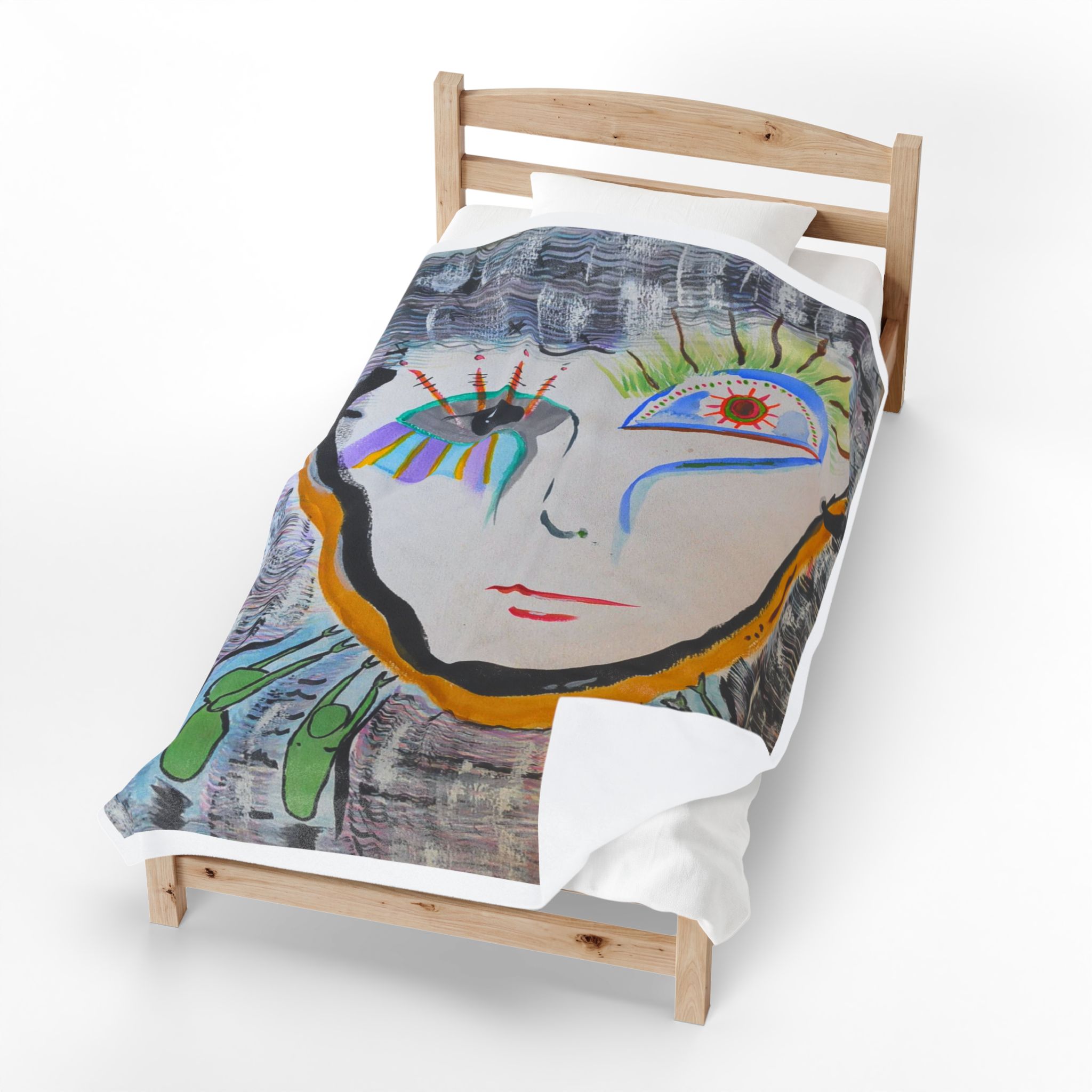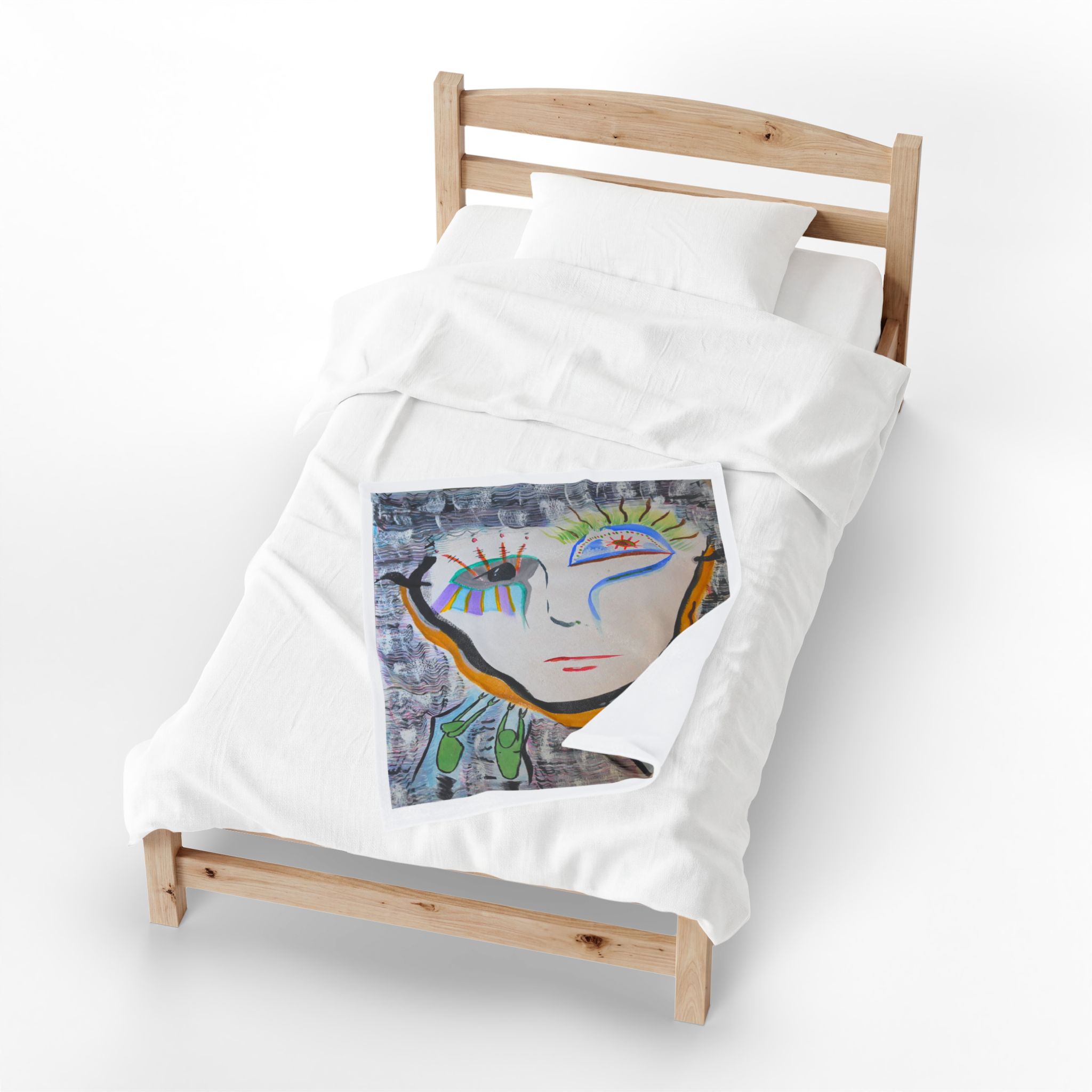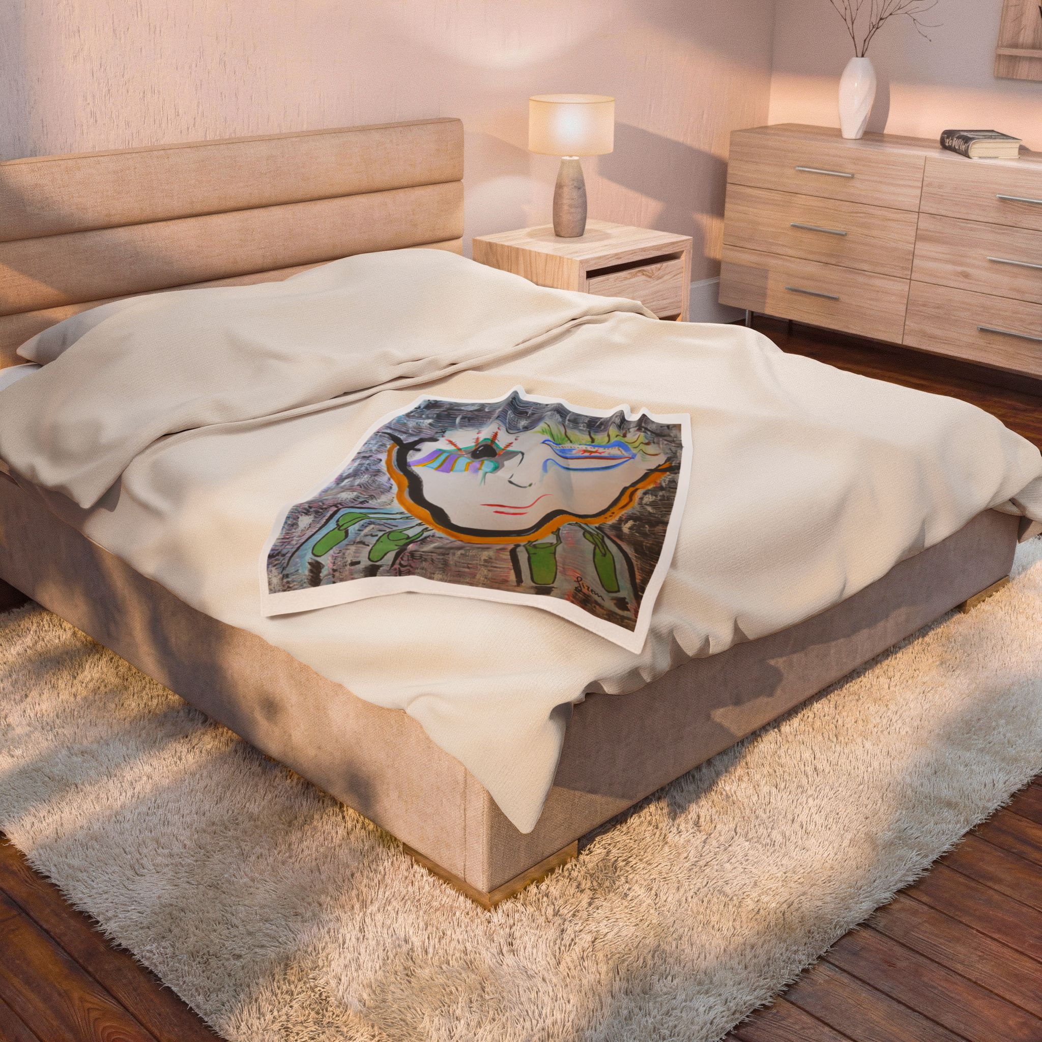 Wrap yourself in a wearable piece of art that feels like a quiet afternoon in a sunlit studio. This velveteen plush blanket pairs a painterly portrait and whimsical floral spirals with a buttery-soft, medium-weight fabric that holds colour beautifully. It settles in warm, plush comfort across your knees while the lively, hand-drawn design adds an artful note to a living room sofa, a reading nook, or a creative workspace. Thoughtful double-stitched edges keep the shape wash after wash, and the single-sided high-detail print keeps the artwork vivid without overwhelming the room. Reach for it when you want comfort with character — a small, tactile way to bring colour and calm into everyday moments and slower celebrations among friends and fellow art lovers.