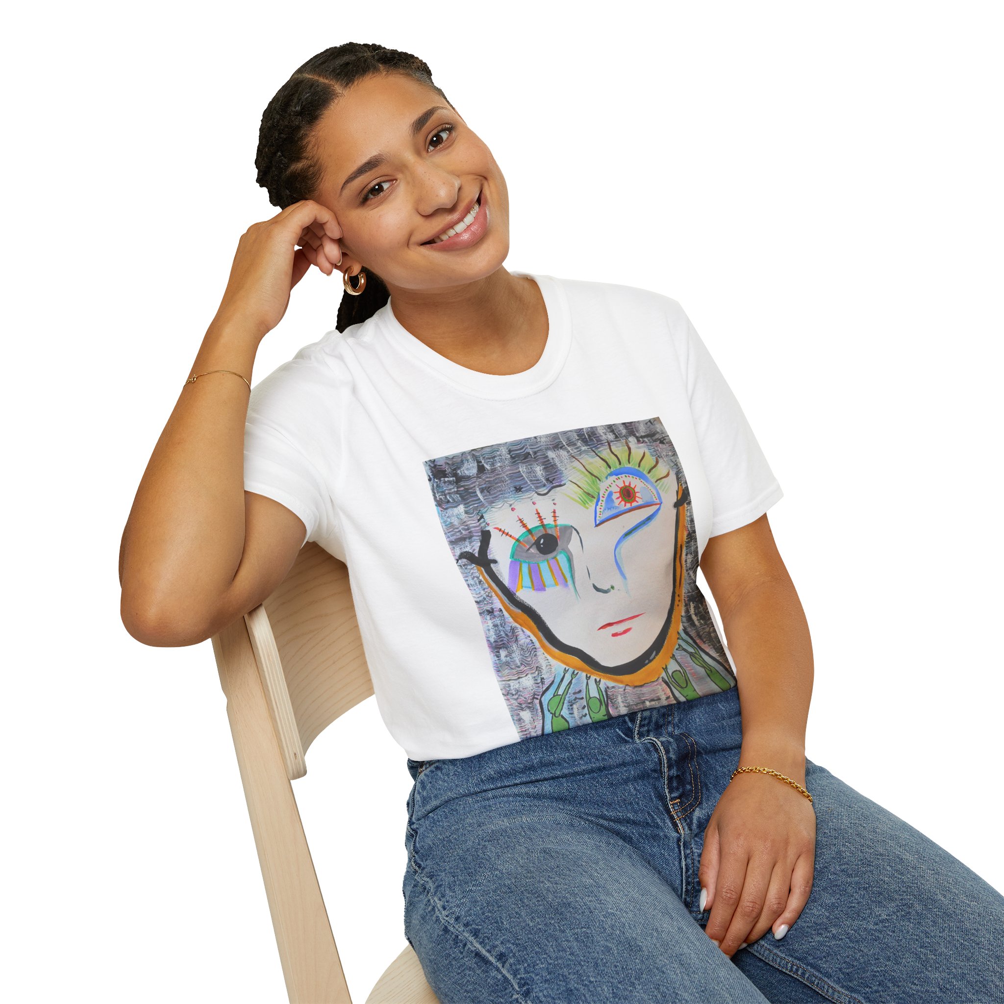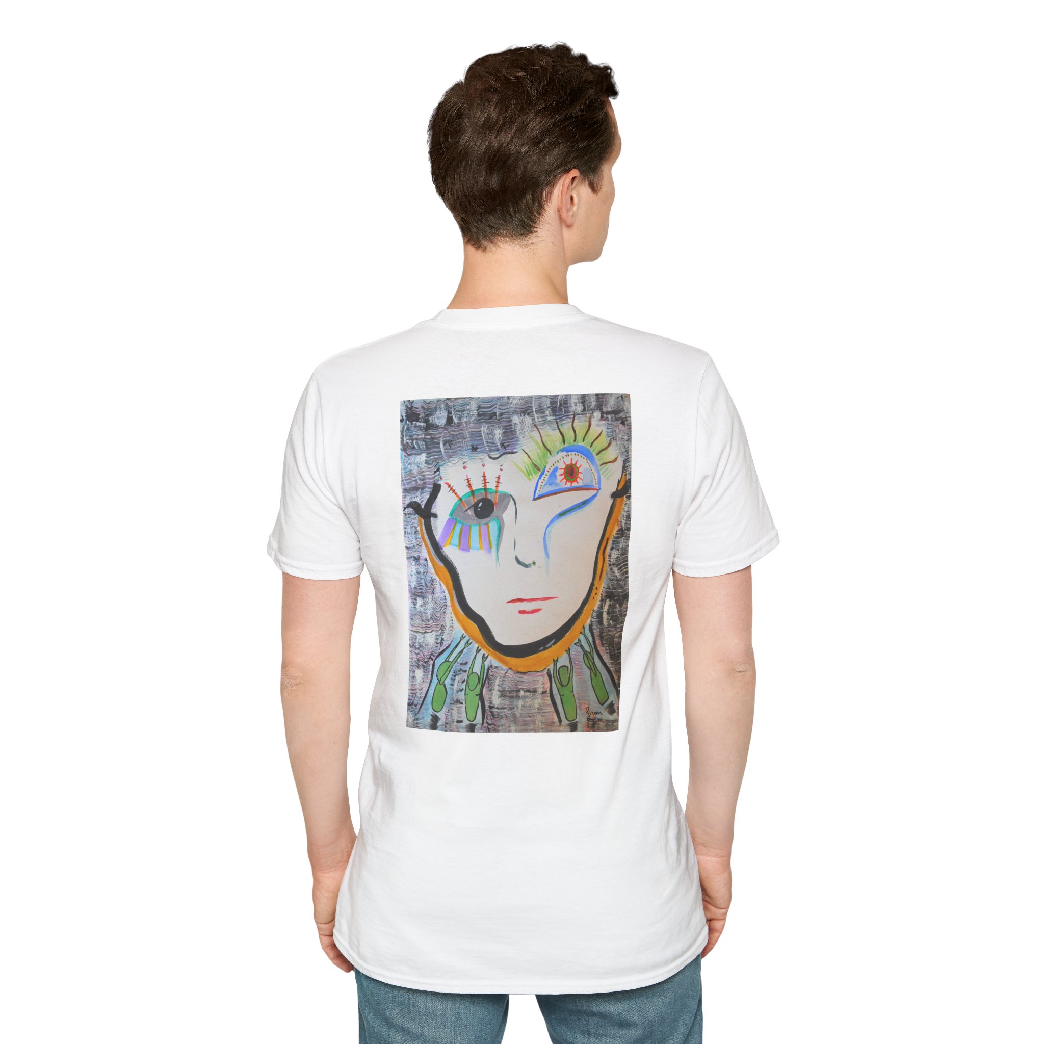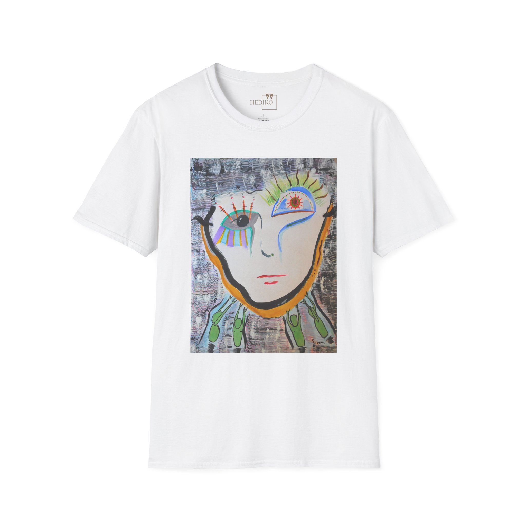 This lightweight crew-neck tee carries a hand-drawn, surreal portrait printed on a soft white canvas. The illustration feels like a private sketchbook page turned into wearable art. It settles comfortably over the shoulders, hangs with a clean classic fit, and reads like a quiet, thoughtful statement rather than loud branding. Wear it to studio visits, gallery nights, or slow coffee mornings when you want clothing that nods to creativity and curiosity. The breathable ring-spun cotton keeps the focus on the artwork while offering all-day ease and subtle texture from ethically grown fibres.